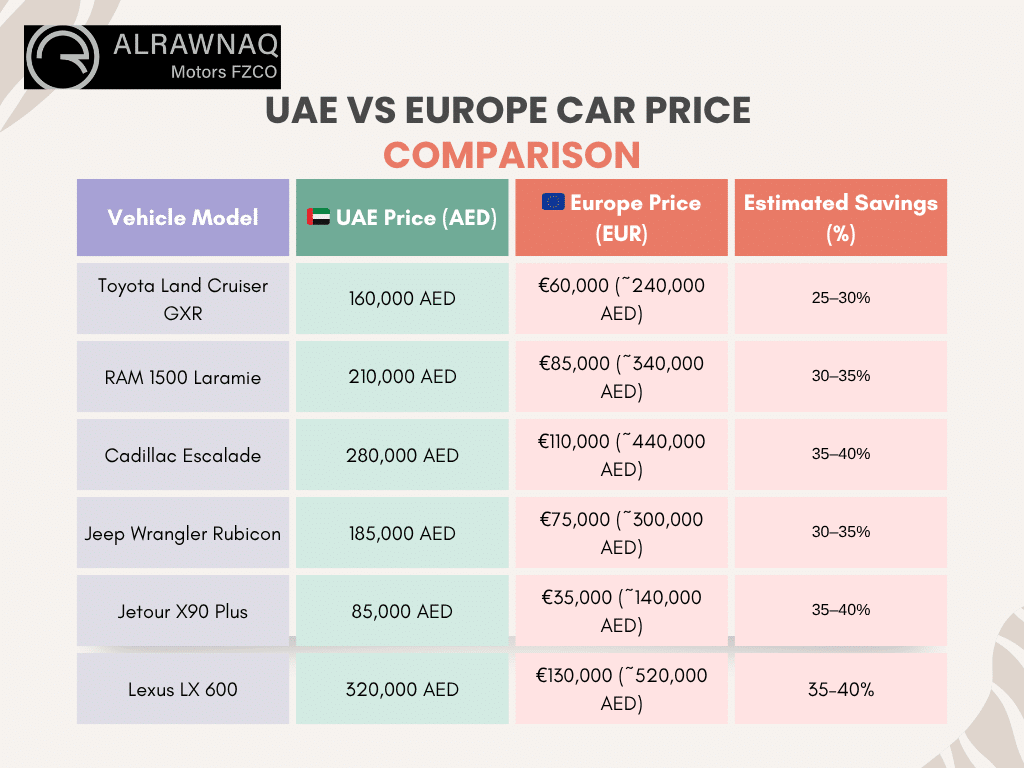 Even with these costs, total landed prices remain 20–30% lower than buying locally. For instance, a Range Rover costing AED 250,000 in the UAE might total AED 350,000–400,000 in Europe—still saving AED 50,000–100,000, especially attractive for luxury vehicles.