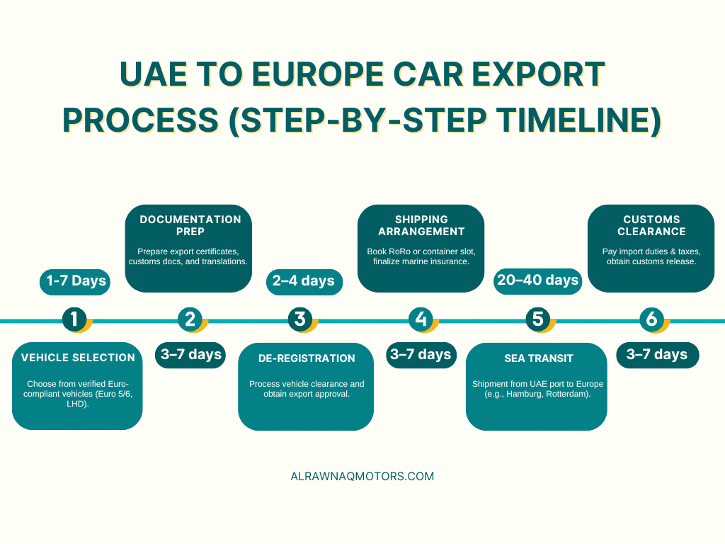 Exporting a car from the UAE to Europe takes about 6–10 weeks from purchase to port arrival. Success relies on accurate documentation, the right shipping method, and experienced export agents familiar with both UAE and EU regulations.